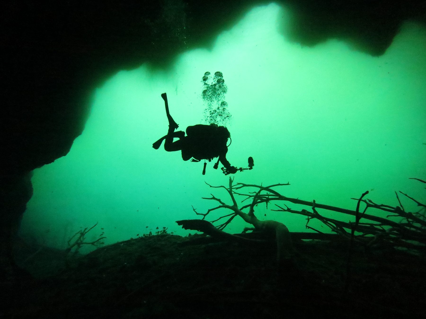An underwater sinkhole. The light shifts as you descend through the halocline — green at the top, electric blue below.